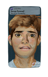 A handful of my student's work focused on the object-ness of their painted screenshot. Tianyi Liu decided to include red thread in their painting Say the Price Again, as if the tactile feel of viewing a product in-person could be conveyed through online shopping. Alia Frickensmith pasted a separate piece of paper to their screenshot which is painted on the front and back as her phone case. And Shayla Torres painted her screenshots on cut pieces of cardboard. The tattered, uneven edges call attention to their hand-made qualities and are in sharp contrast with a phone's slick digital aesthetic.